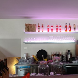 La zone café, avec ses suspensions en verre fabriquées en Italie et ampoules E27 décoratives, crée une ambiance chaleureuse et artisanale.