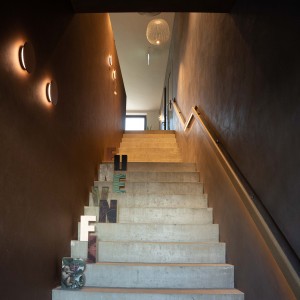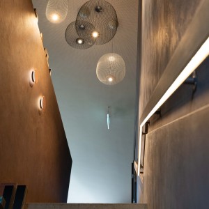 Un lustre avec 8 Wetro 1.0 accompagne les déplacements dans l'escalier principal, guidant les personnes d'un niveau à l'autre avec élégance.